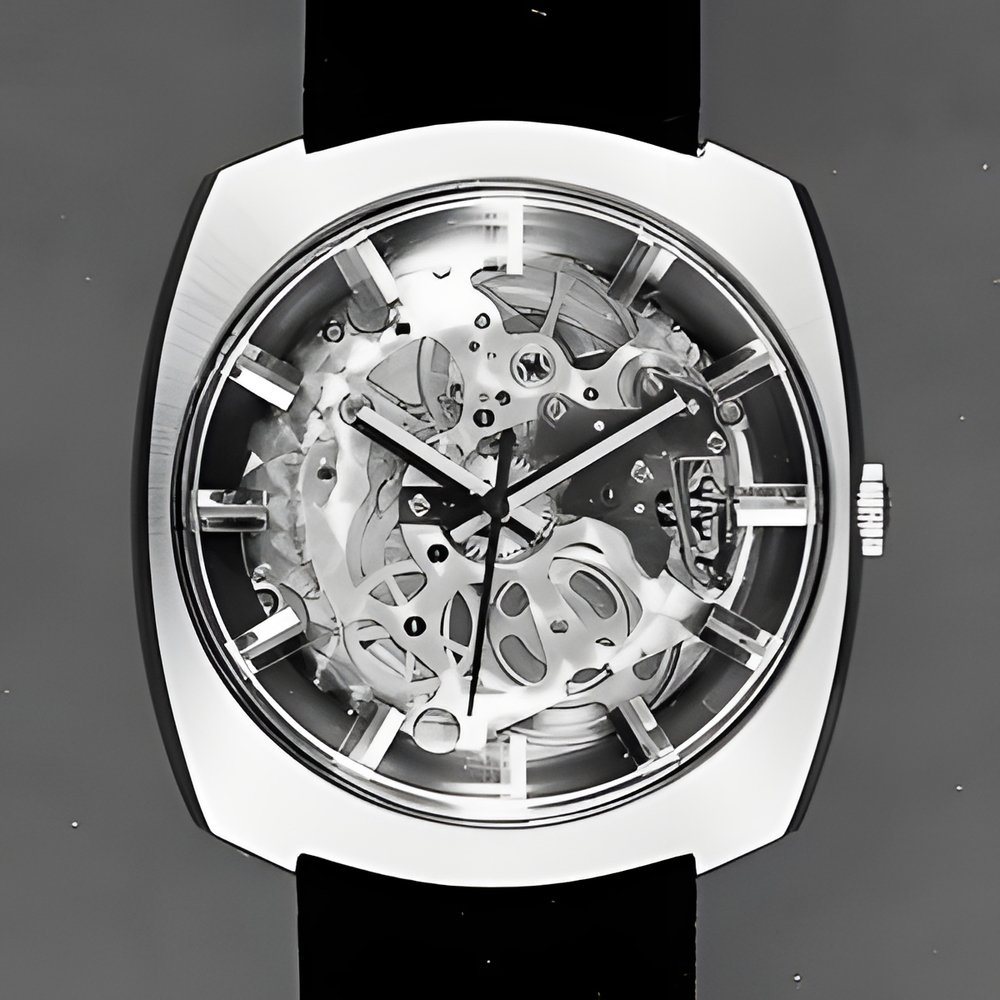 The “Skeleton” type watch. The movement is revealed by removing the dial and open-working all possible parts. Its glittering dance is thus revealed. A decorative technique that was formely found only on luxury models. (VULCAIN “Open Heart”)