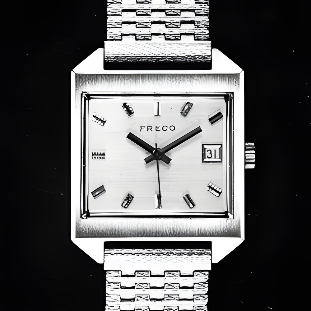Well-defined lines mark this square automatic watch with all-steel water-resistant case facetted guilloché markers on the dial. (FRECO)
