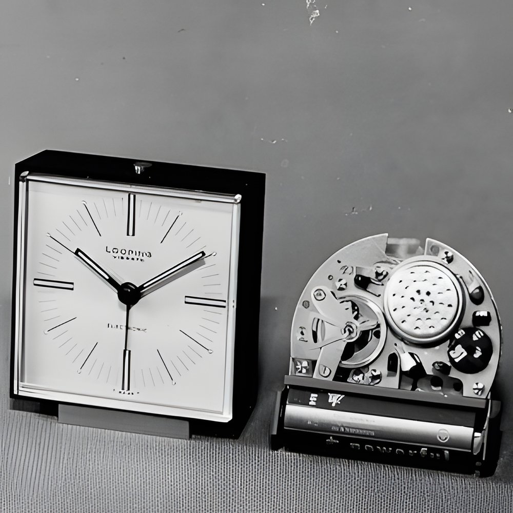 A new electronic movement for small clocks. It is transistorized and self-starting. Functional layout electronic module with built-in alarm (printed circuits), separate mechanical module Low energy consumption. Electronic alarm having no influence on the battery (18-month life). Self-lubricating nylon bearings. Case in synthetic material and metal base. (LOOPING Vibrato")