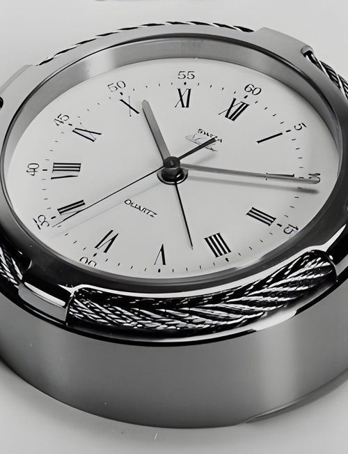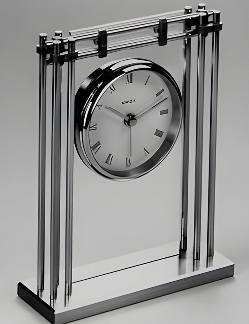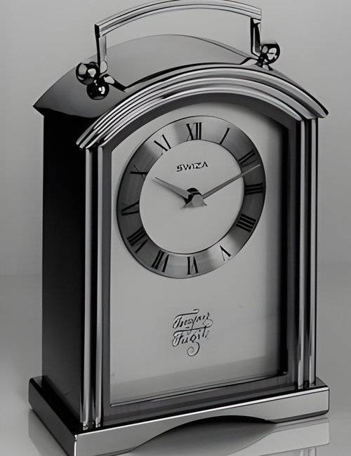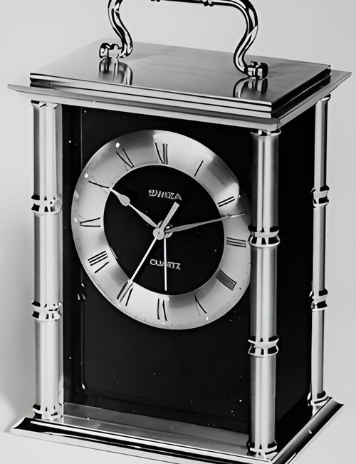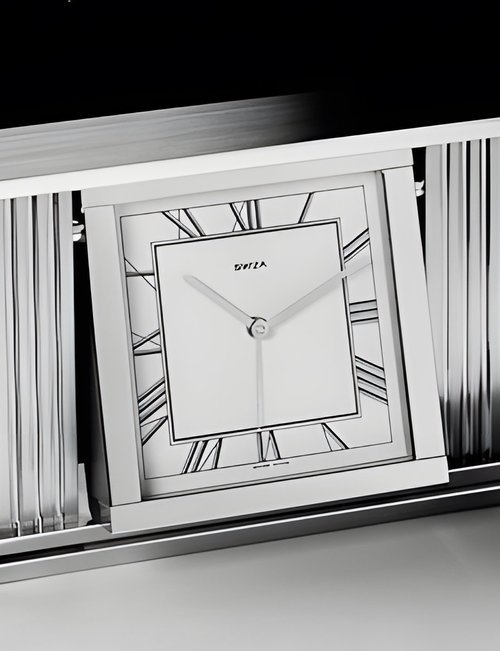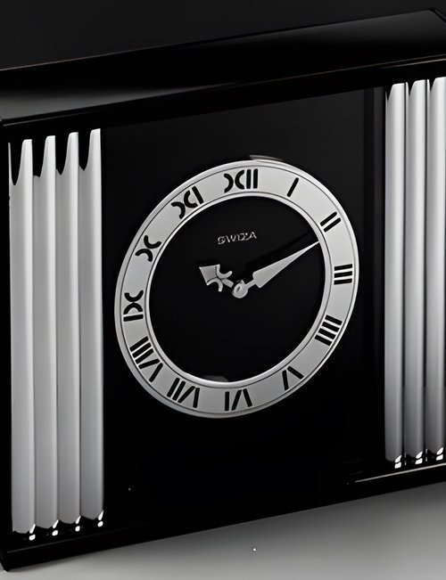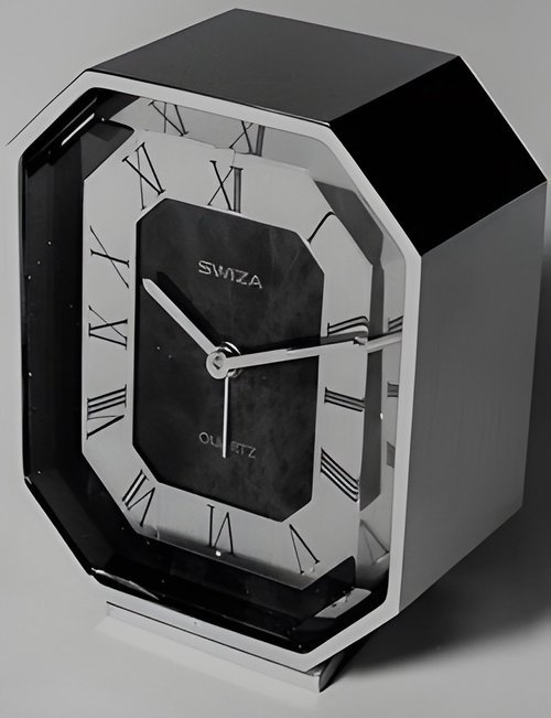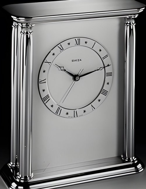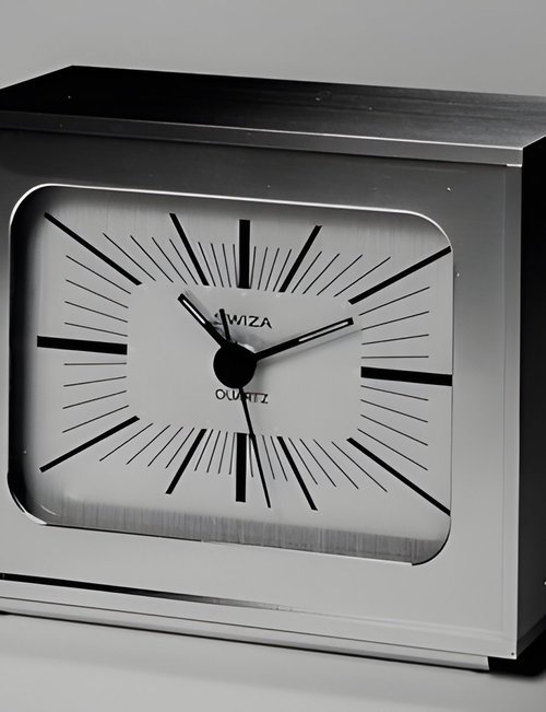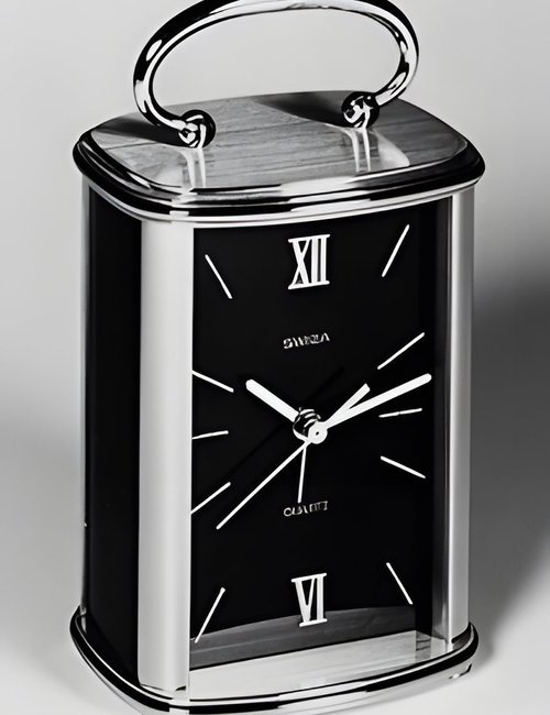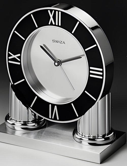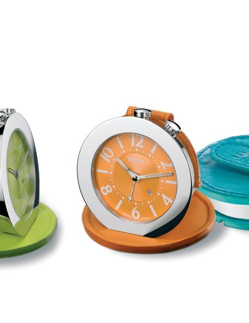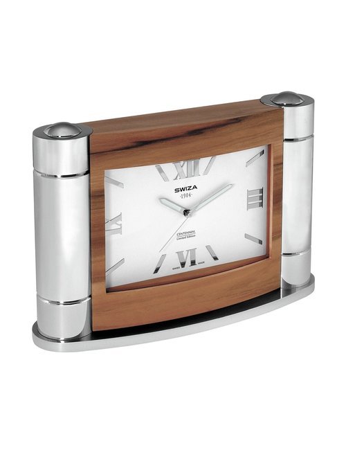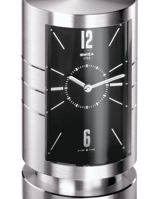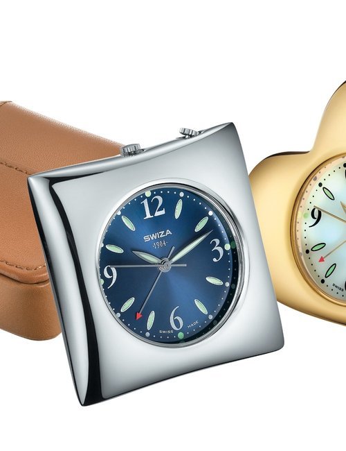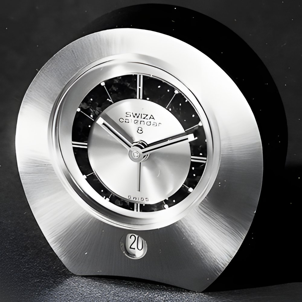 Small modern alarm with dial in imitation lapis lazuli. Gilt metal case with brushed bezel in which the calendar aperture is located. 8-day movement. (SWIZA)