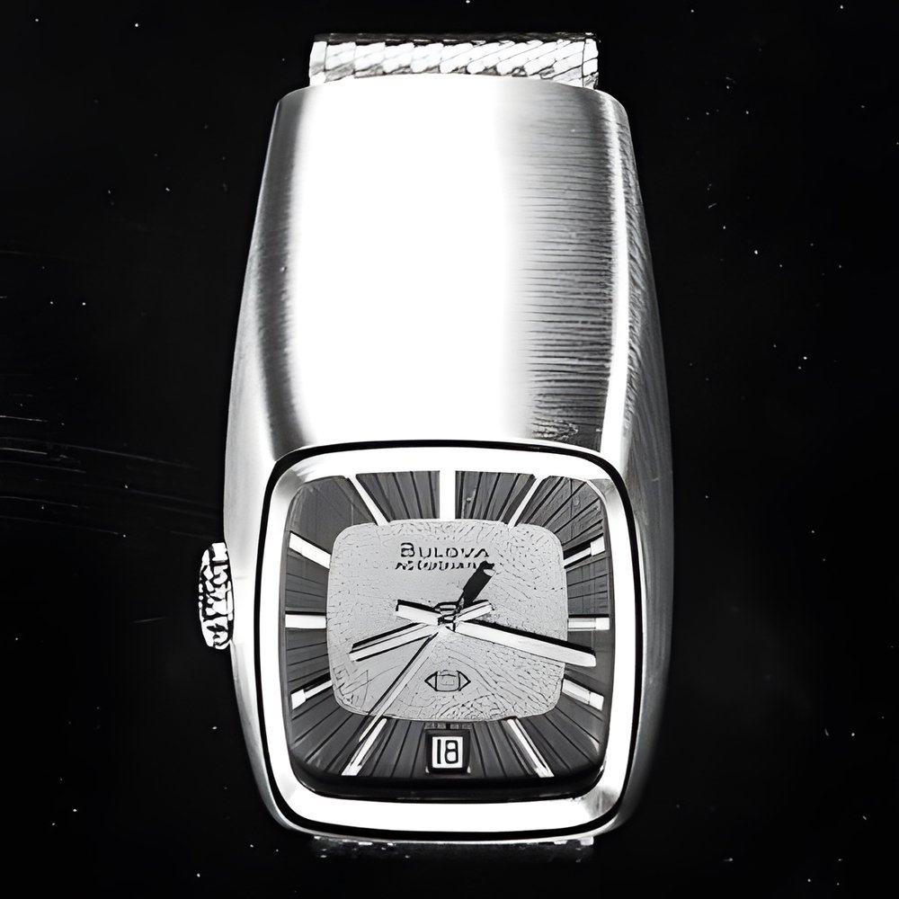 A great amount of research has been invested in the movement of the quartz watch and the same can be said for its styling. This model, the result of extensive industrial design efforts, follows the shape of the wrist. Its slightly inclined dial allows the wearer to read the time without moving his wrist. Case and bracelet are in 18 ct. yellow gold. (BULOVA “Accuquartz”)
