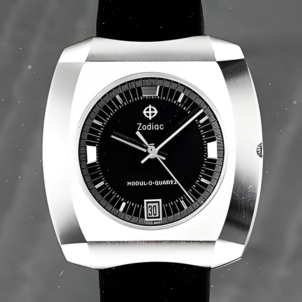 Modern lines for a modern watch. Shown here is one of the models of the quarts electronic watch with integrated circuits which has just been introduced on the market. Its movement set precision records at international observatory competitions A technical masterpiece and a magnificent example of industrial design. Case in 18 carat gold. (ZODIAC)
