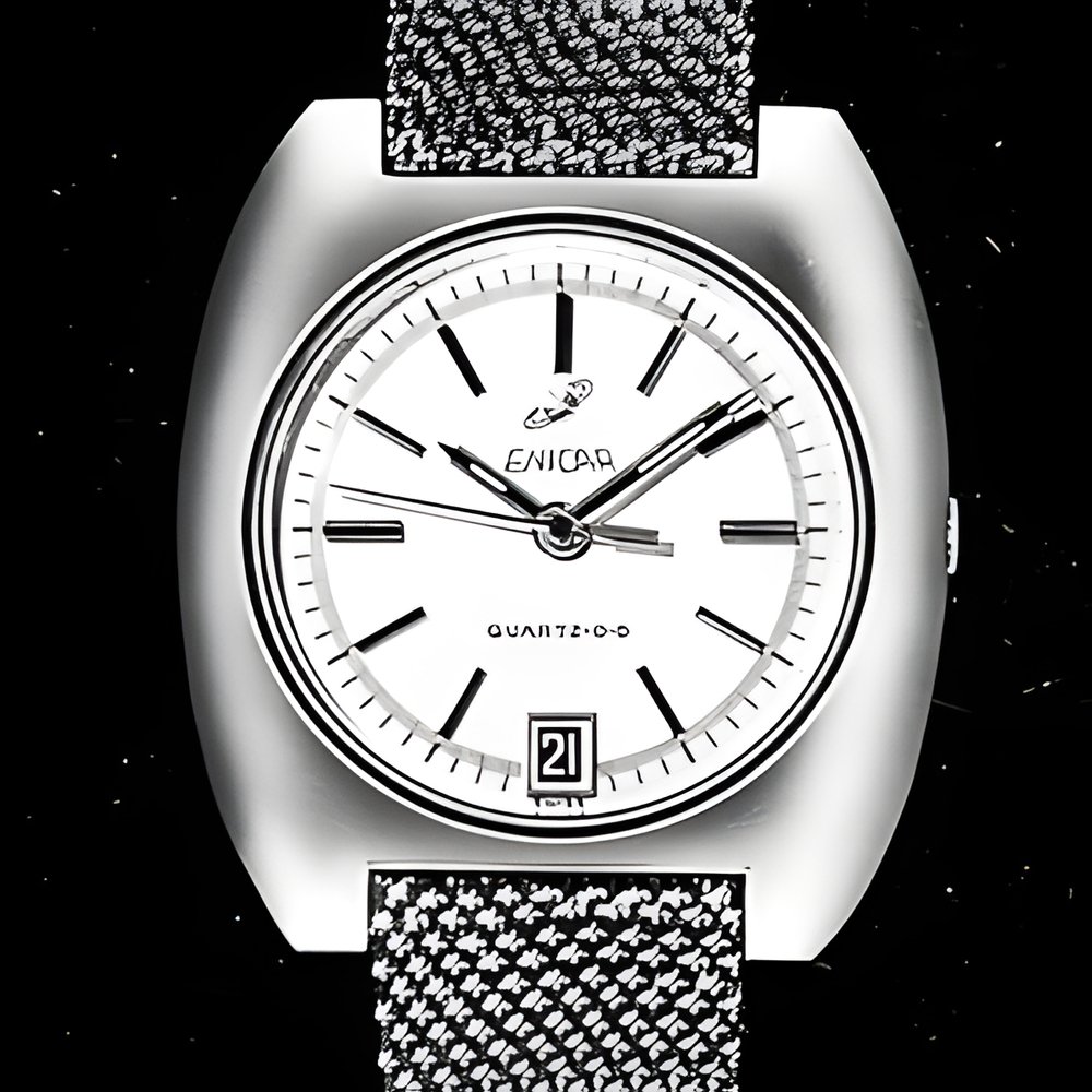 The accuracy of a marine chronometer on your wrist with this quartz electronic watch which is now market-ready. Its precision in-is astonishing annual variation is expressed in seconds. It incorporates the latest advance in electronics low consumption integrated circuits. The quartz - its regulating organ - vibrates at 8’192 cycles per second. (ENICAR)