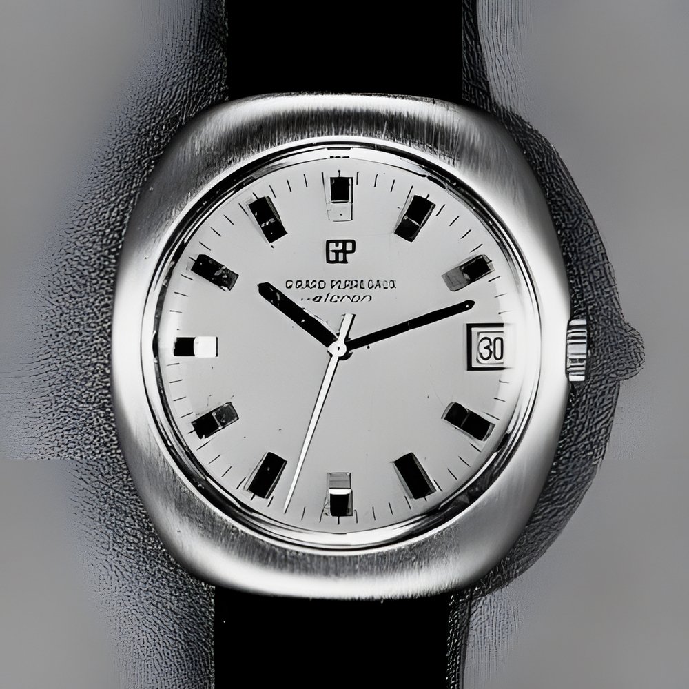 One of the revelations of the 1970 Basle 171i0 The prototype of a quartz electronic watch. 8’192 cycles per second reduced tne pulse per second by integrated circuit frequency dividers (2). A stepping motor transmits the impulse to the hands Power source two 1 ,3 V0 batteries. Precision one minute per year. The movement’s extreme compactness is worthy of note. With calendar. (GIRARD-PERREGAUX “Elcron”)