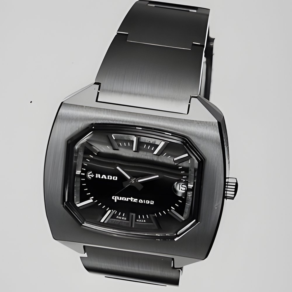A remarkable application of horological industrial design to the Quartz watch. The strongly carved lines of the case houses the quartz electronic movement. With the bevelled studs of its dial and the wide articulated bracelet integrating to the case the watch gives off an impression of typically masculine strength. With calendar. (RADO “quartz 8192”)
