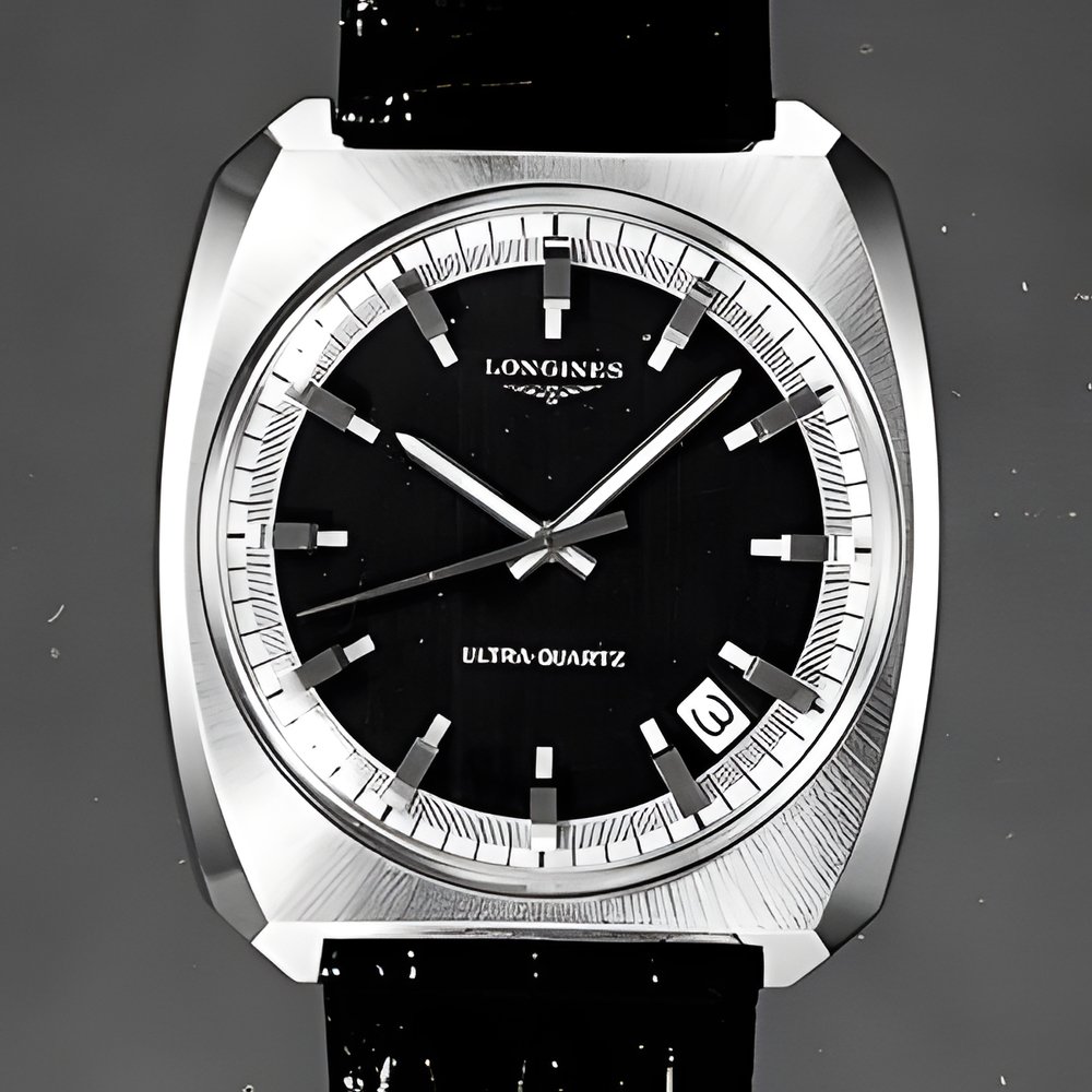 Here is the cybernetic quartz watch Longines ’ own systems. Its movement incorporates two oscillating circuits, each governing the other by means of a comparator circuit. Annual variation is less than one minute Battery life 18 months A i ’ 000-unit series, presently being manufactured, will be put on the market at the beginning of 1971. (LONGINES “Ultra-Quartz”)