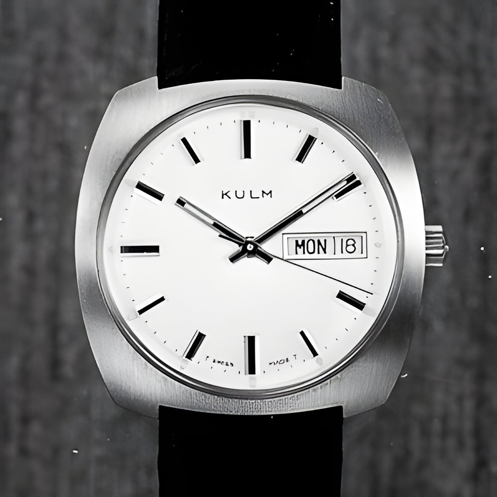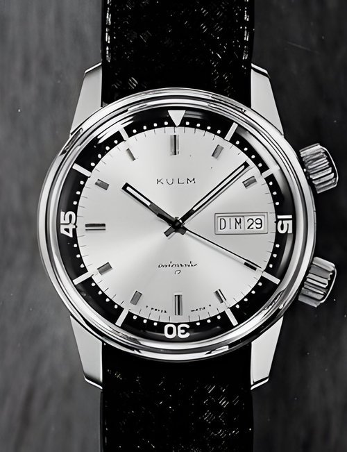 A watch for the man who lives with the times It has a large, highly legible dial, precise minute-circle and onyx-incrusted hour-makers. Cambered case into which the bracelet flows directly. Automatic movement with ball bearing, day and date calendar. (KULM)