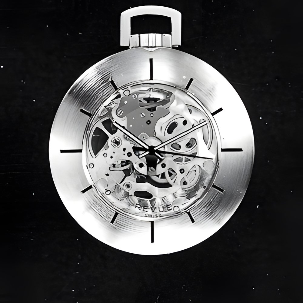 “Skeleton” type pocket watch. The movement is revealed by removing the dial and openworking all possible parts. Its glittering dance is thus revealed. A decorative technique that was formerly found only on luxury models (REVUE “Open Heart”)