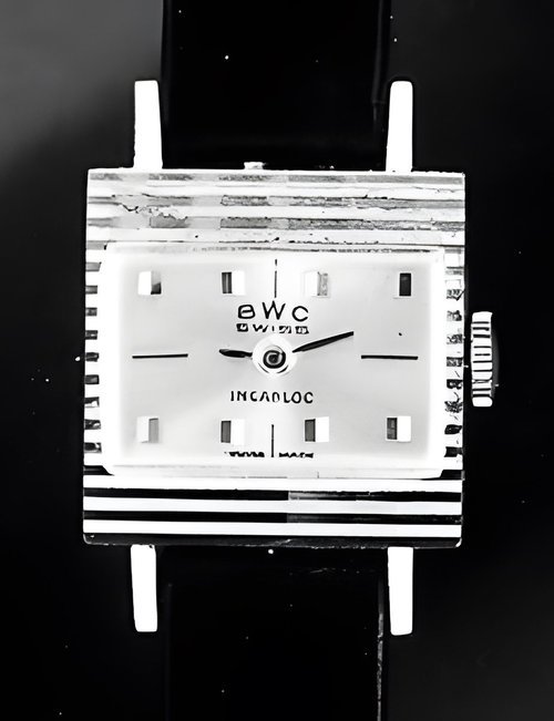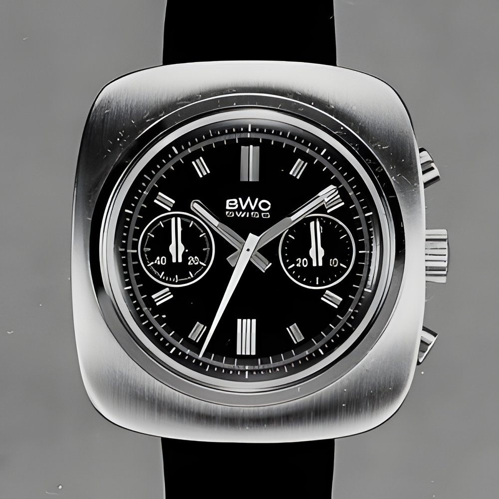 case is steel and water-resistant . Black dial, a wide flange with two division circles : 1/5th second and decimal. Integrated bracelet. (BWC - Buttes Watch Co.)