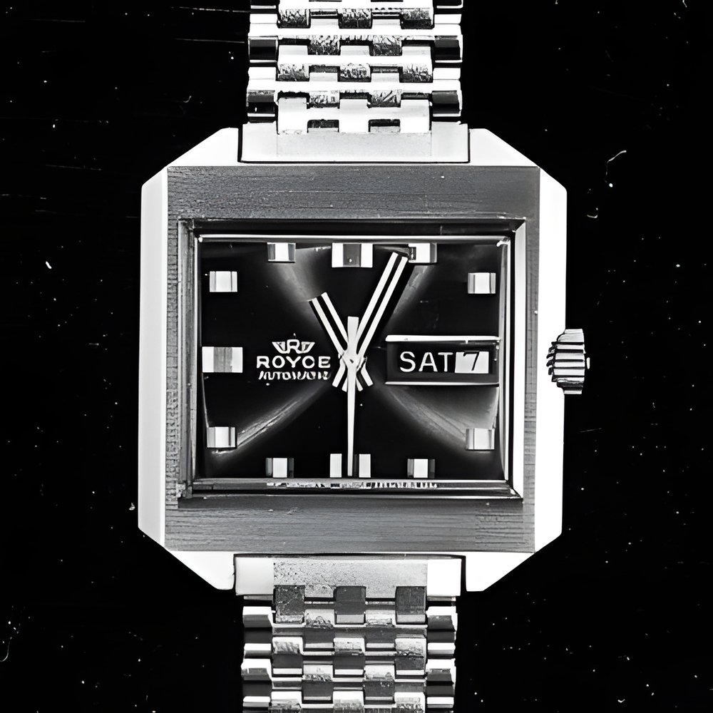 Strongly stressed lines for this automatic watch with day and date calendar. The metal bracelet fits directly into the all-steel waterresistant case. Blue dial with large, raised hour studs. (ROYCE)