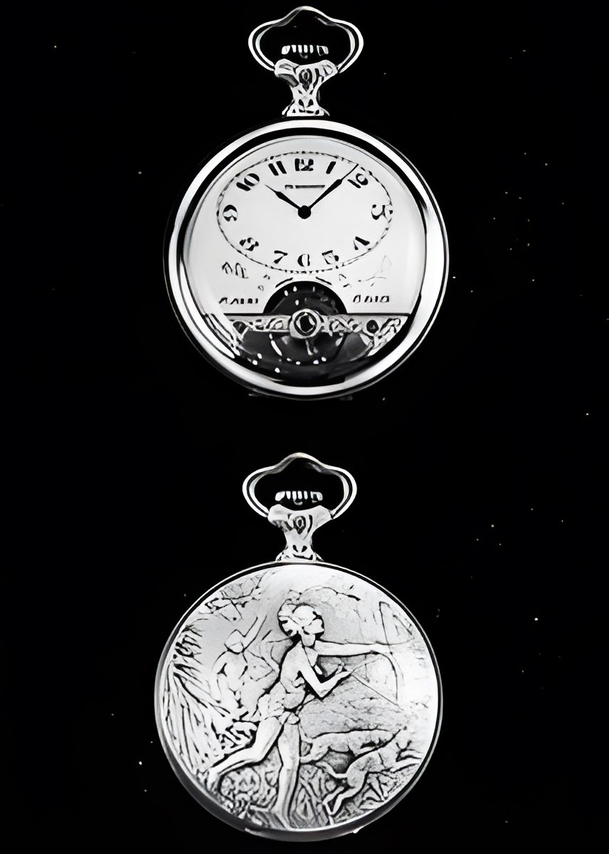 This “antique style” pocket watch’s movement will run for 8 days without rewinding. The balance-wheel is visible under the enamelled spangled dial. Raised decor on the back of the old silver style case. (SCHILD-HEBDOMAS)
