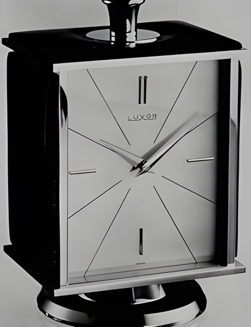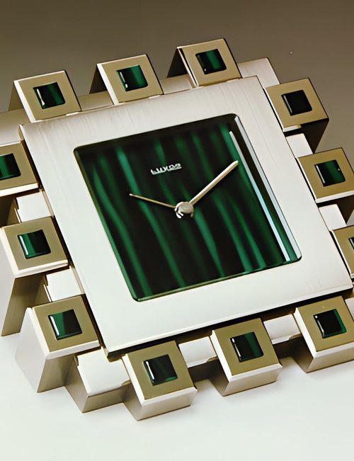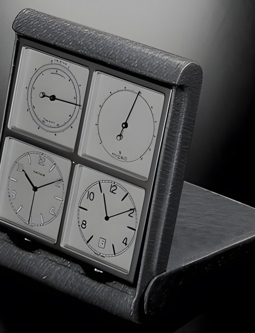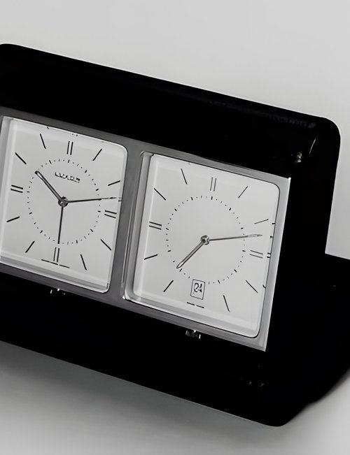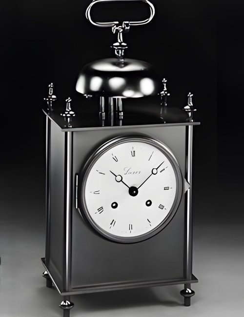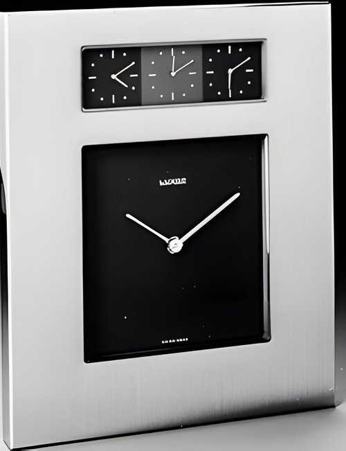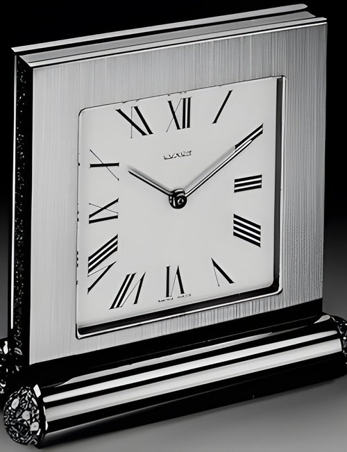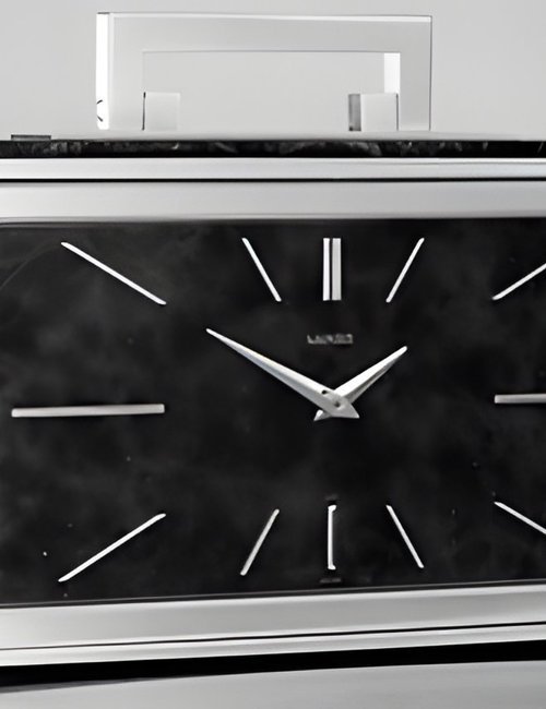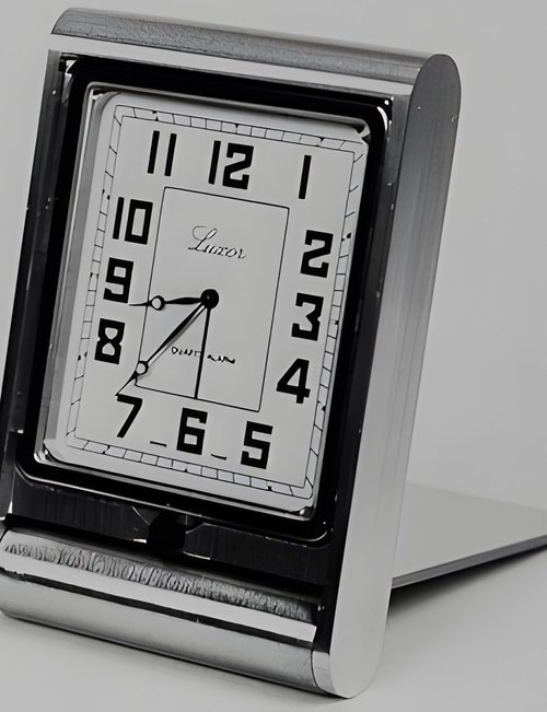 Pigskin covered travelling clock with electronic movement. The alarm mechanism, also electronic, emits a characteristic sound through a tiny loudspeaker lodged in the case. Also available in box calf, alligator or lizard skin. (LUXOR)
