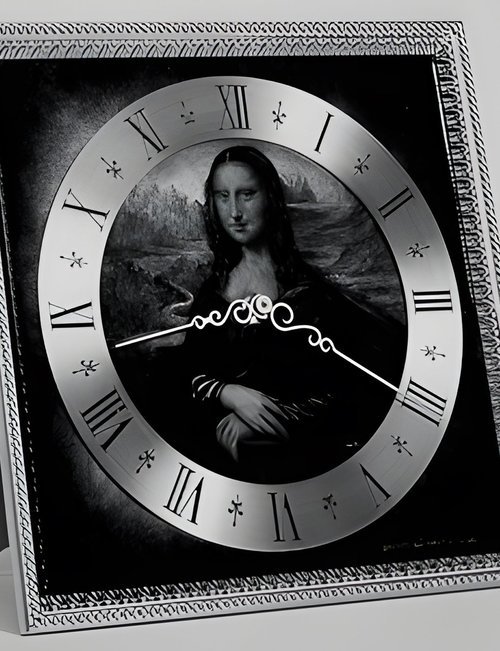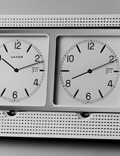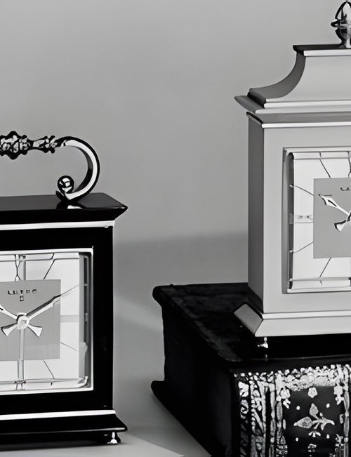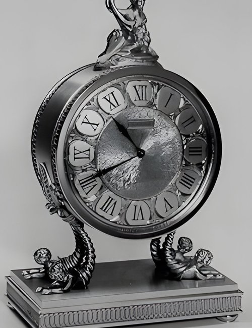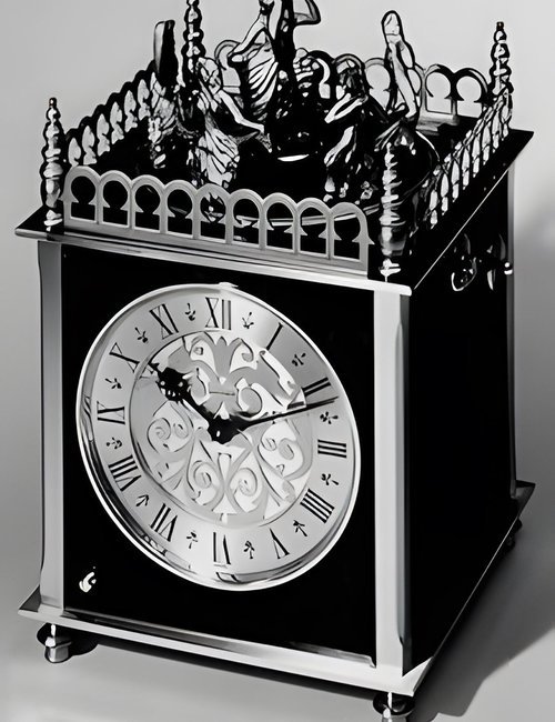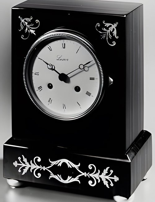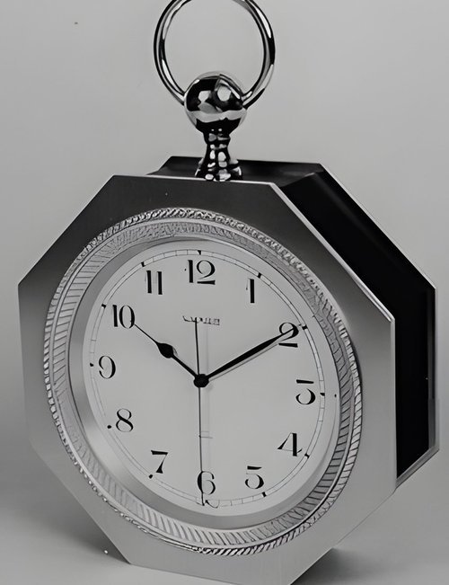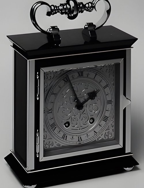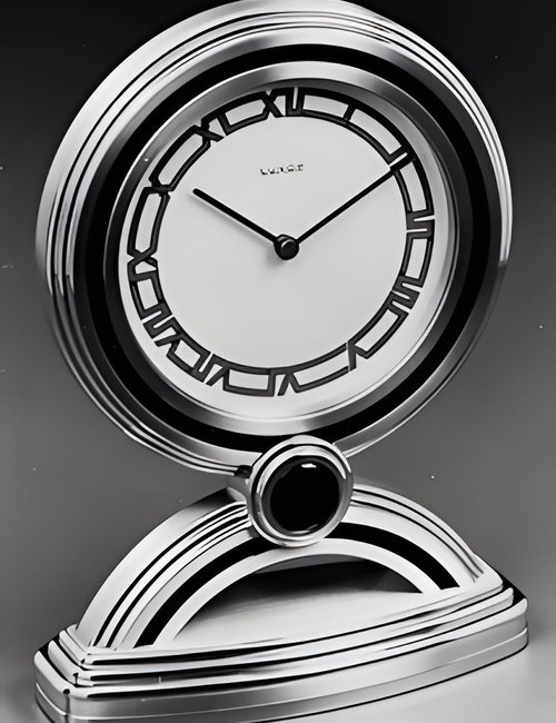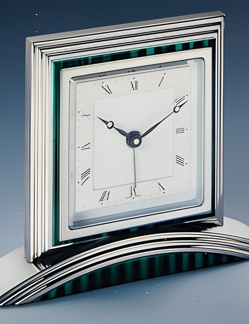 Pigskin covered travelling clock with electronic movement. The alarm mechanism, also electronic, emits a characteristic sound through a tiny loudspeaker lodged in the case. Also available in box calf, alligator or lizard skin. (LUXOR)