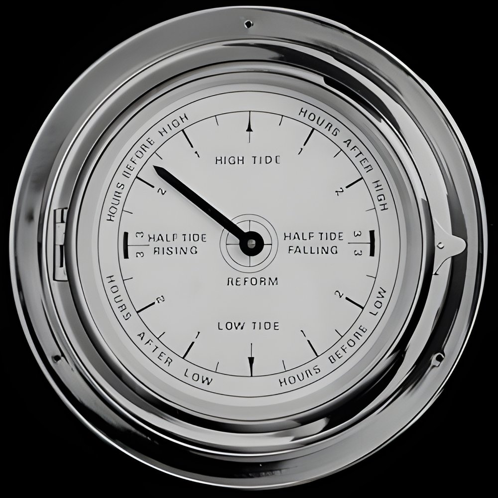 No sailor will soon want to be without this shipboard instrument: a tide-gauge which indicates tidal movements, doing away with tide tables. The case, chromed or with ovenhardened vellulose finish, is protected against humidity. The case front opens for regulation. Can be fitted to an instrument panel. (REFORM)