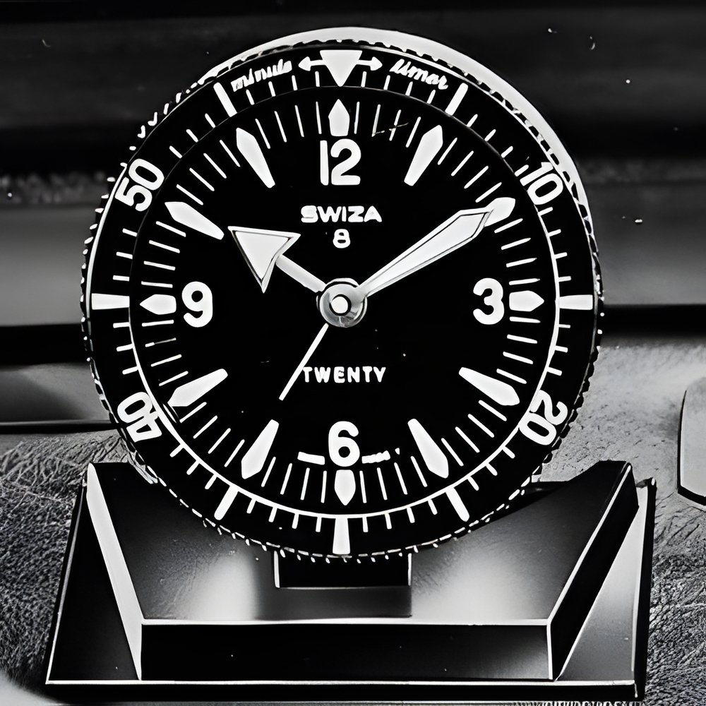 The multi-purpose “Twenty” alarm clock here shown mounted on an instrument panel. Equipped with a magnetized base and a selfadhesive metal plate, it can be affixed anywhere. 8-day movement and minute-register turning bezel. (SWIZA “Twenty”)
