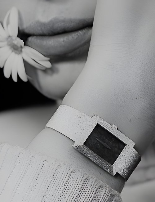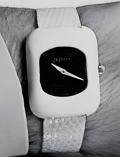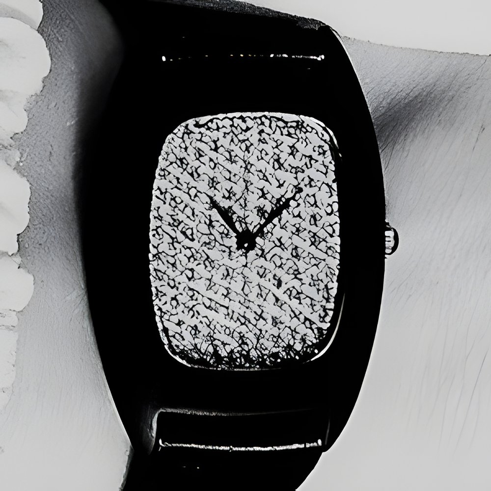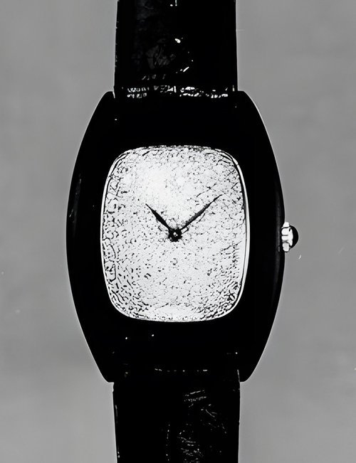 A truly original evening watch. The case is ebony and the dial is entirely paved with brilliant-cut diamonds. Also available in ivory, mahogany and olive wood, with gem-set or gold dial. (DELANO)