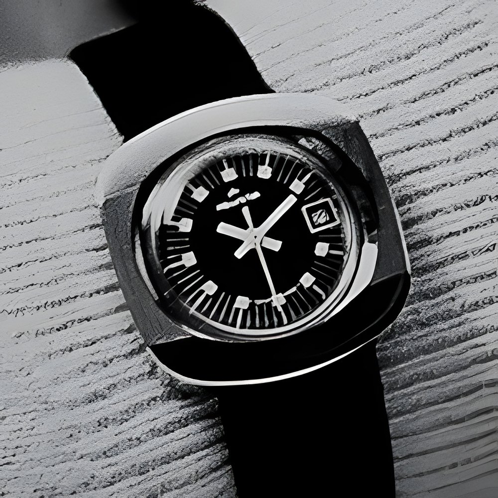 A major success story of today the automatic lady’s watch. This model has all the features befitting a sports watch yet its elegance is a passport for town wear. Water-resistant case, shock-protection . . . and even a calendar. Blue dial. (HELVETIA)