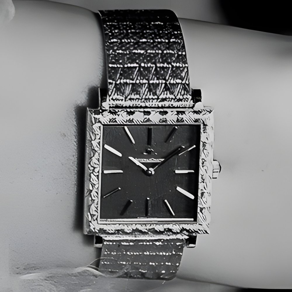 A subtly designed model, lust as suitable on a feminine wrist as on a masculine forearm. Square reed 7 decor case with motifs engraved in 18 carat yellow gold. Smoked dial. (JAEGER-LECOULTRE)