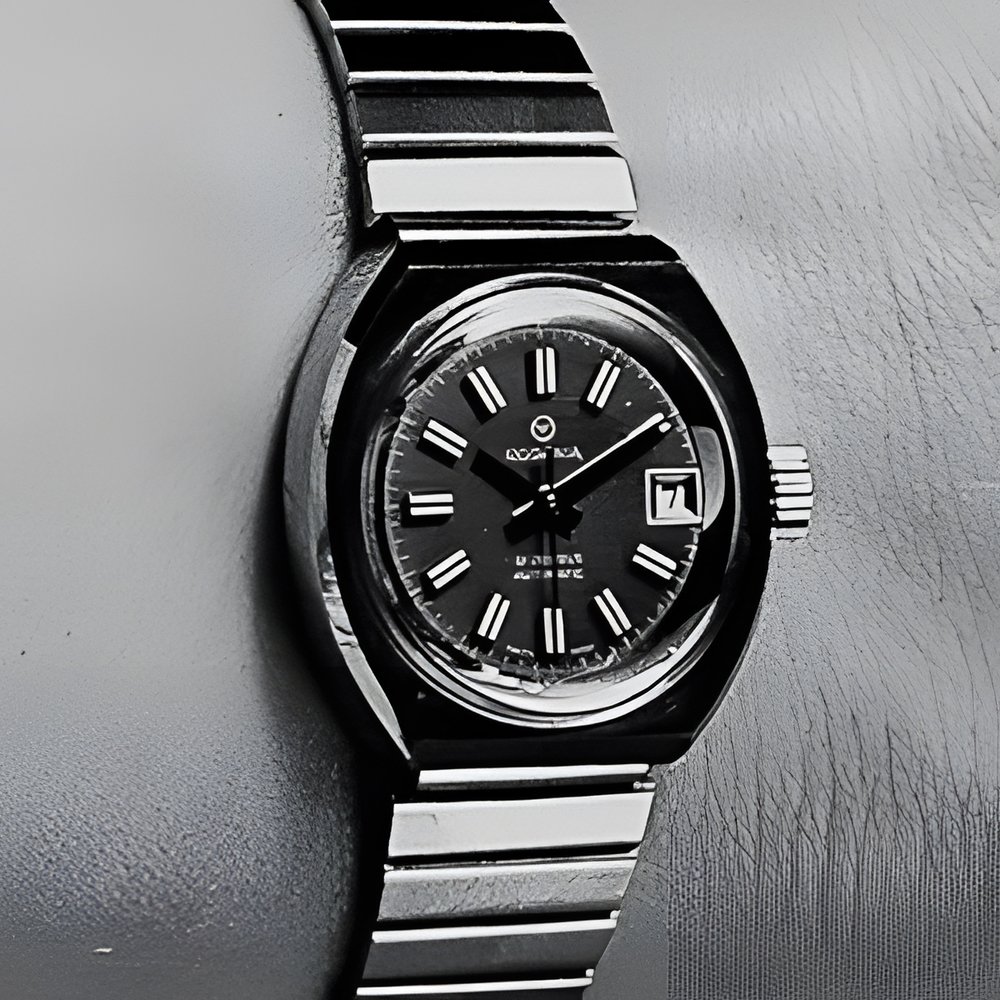 Automatic watches shrug off both water and shocks. Their elegance makes town or country wear equally possible. Steel or goldplate case with water-resistance guaranteed to 5 atmospheres (a depth of 50 metres). Silvered or blue dial with hollowed out applied hour-markers. With calendar. (RODANIA)