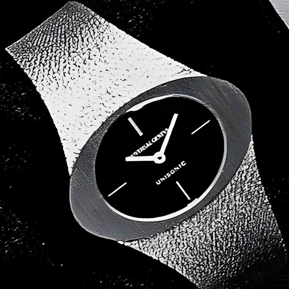 The last word in both stylii.ig and technology. Under the doubleoval lines of this case hums a tuning-fork electronic move-ment. Its elegance is vividly illustrated in the perfect match of bracelet and case, both in white gold Blue dial in flinqué enamel. (UNIVERSAL “Ladysonic”)