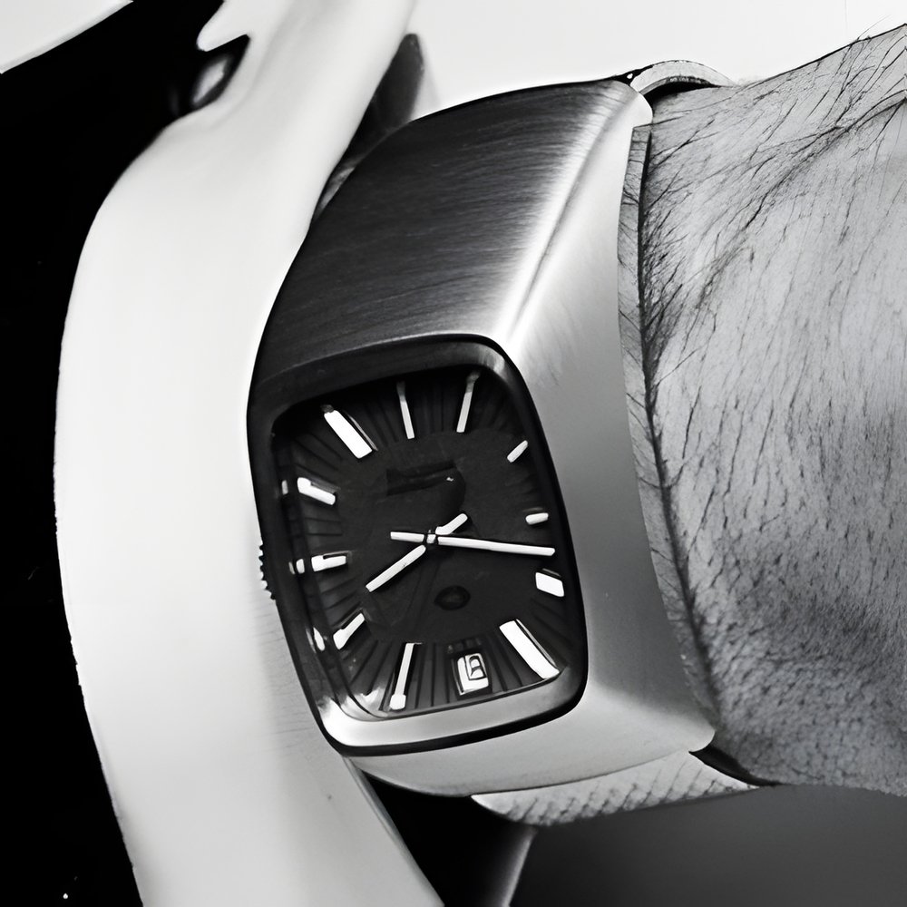 A great amount of research has been invested in the movement of the quartz watch and the same can be said for its styling This model, the result of extensive industrial design efforts, follows the shape of the wrist. Its slightly inclined dial allows the wearer to read the time without moving his wrist. Case and bracelet are in 18 ct. yellow gold. (BULOVA “Accuquartz”)