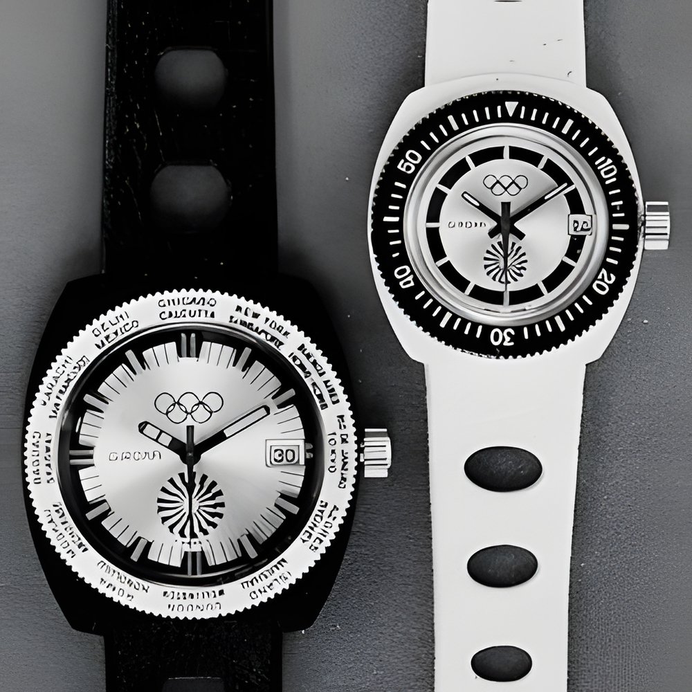 Here are the official watches for the 1972 Olympic Games in Munich, as shown by the olympic rings inscribed on the dial. These are very modern men and ladies models with synthetic (Fiberglass) case, water-resistant to 5 atmospheres (a depth of 50 metres). rrurning bezel for measuring elapsed times. Case available in a choice of colours, sporty dial, calendar. A chronograph version of this model is also available. (BELVIL-GIROXA)