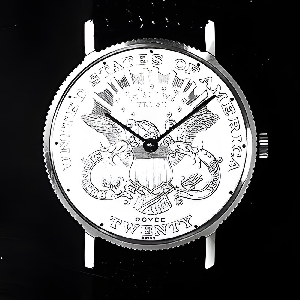 The coin-watch. Its dial is a faithful replica of a US twenty dollar gold coin. Unlike the original, however, it is available in goldplate. (ROYCE)