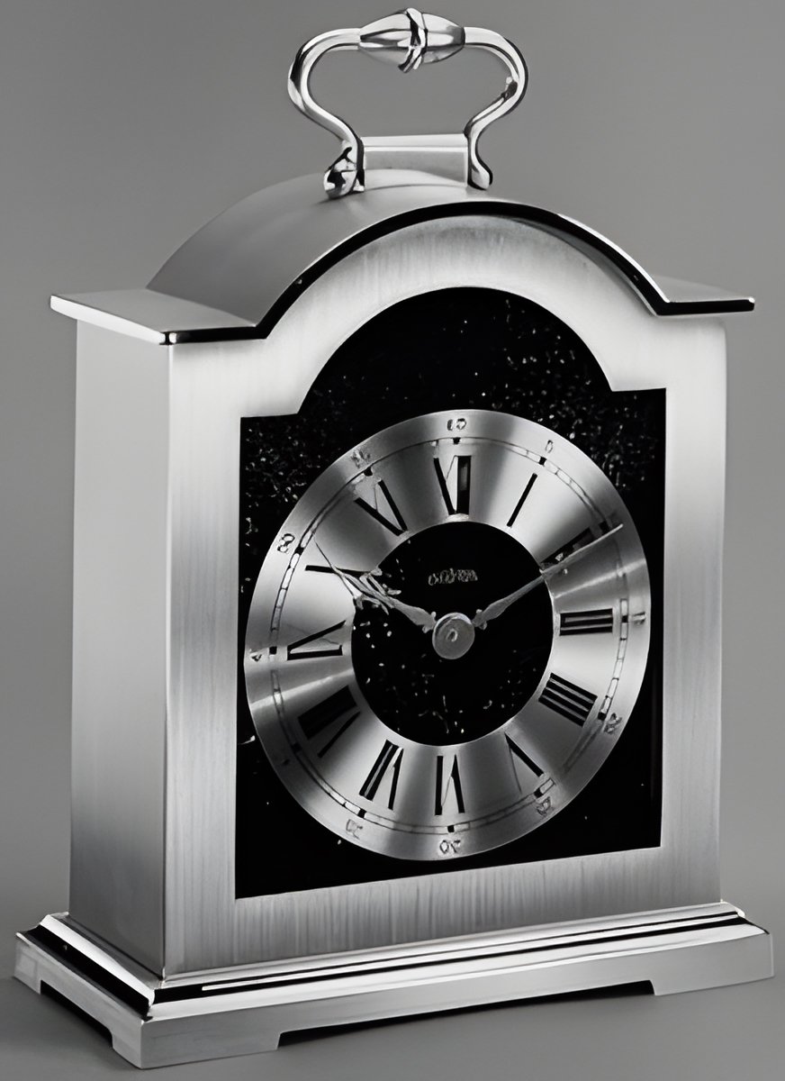 Small period clock with neat, restrained styling. The brass hour circle with enraved black Roman numerals st -ads out against the enamelled dial, available in a choice of colours. Choice of batterypowered electronic movement or 8-day movement with hour and half—hour strike. (ANGELUS)