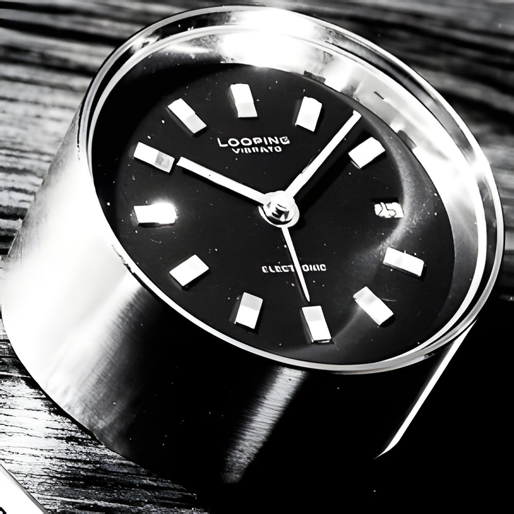 A modern office clock which can double as paperweight. Electronic movement with alarm system to remind of important appointments. Deep blue dial, calendar. (LOOPING)