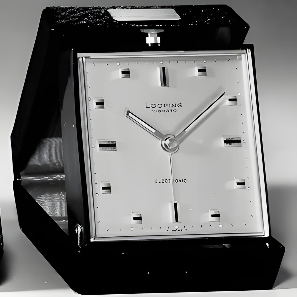 A very practical travel alarm equipped with a compact electronic movement. Comes in a small leather case. With calendar. (LOOPING)