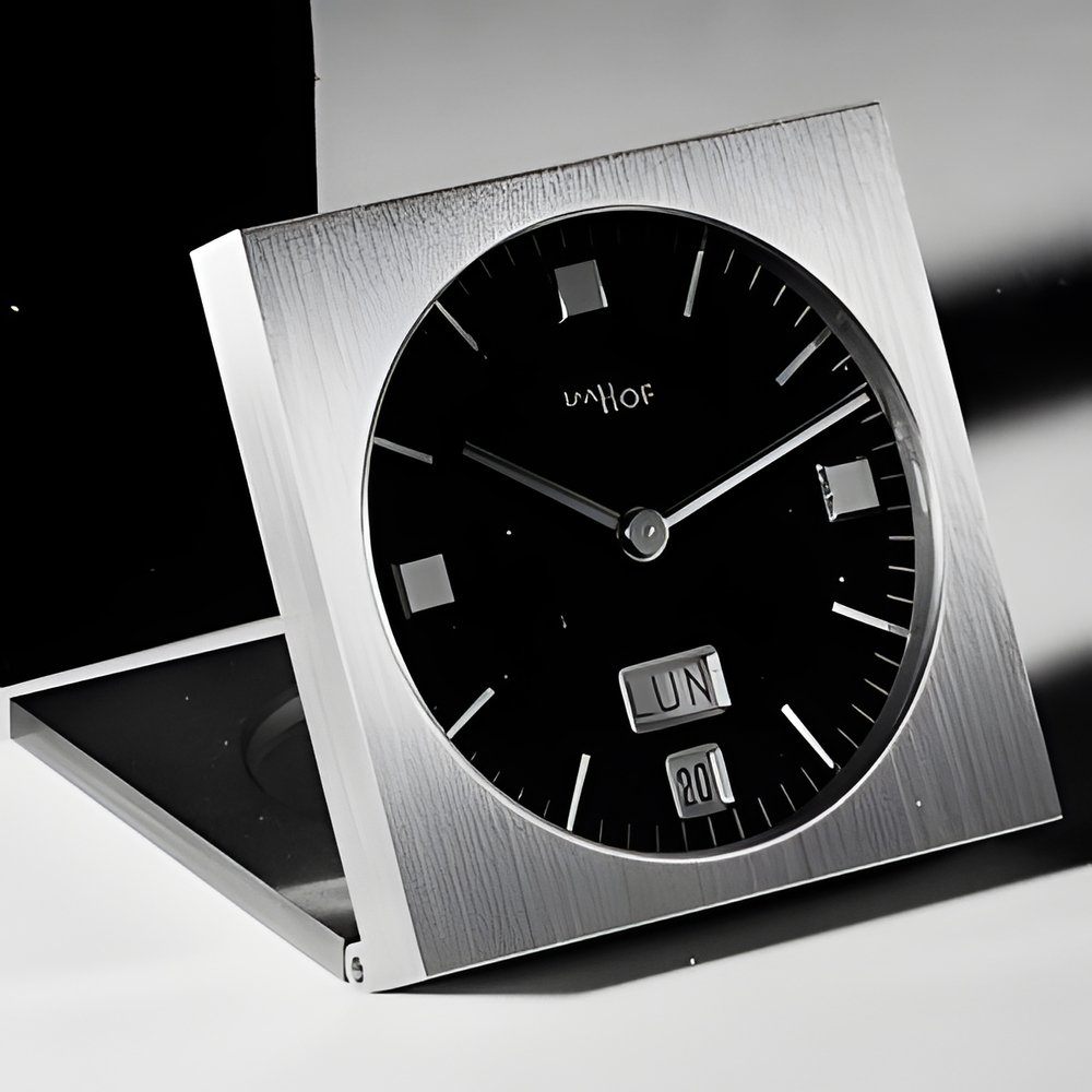 A desk clock which can also be used as travel clock. It fits into a very slim loather case. In steel or gilt satin-finished solid metal. Black dial with polished hour markers. 8-day movement with day and date calendar. (IMHOF)