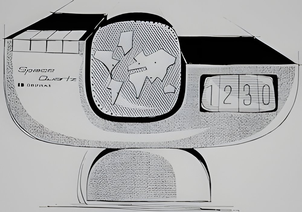 A drawing of an entirely new desk clock with quartz electronic movement. The digital display of hours and minutes is controlled by the keys at loft. The time in a number of time-zones can thus be read in a flash. The seconds are marked by luminous dots which light up around the centre planisphere. (DEPRAZ-FAURE “Space Quartz”)