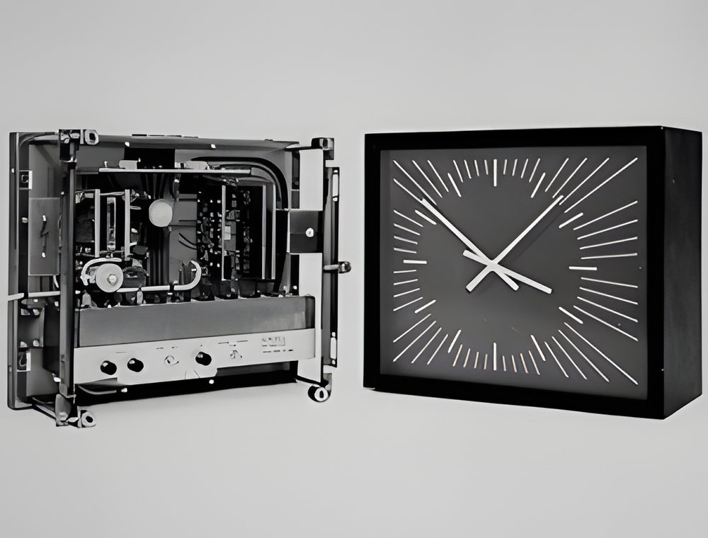The world’s first quartz time centre in industrial production. Consequently, its price is particularly attractive. Yet its stability is impressive (2-10-8, i.e. 0.002 seconds per 24 hours); possibility of connecting up to 30 slave clocks. Connection to the mains supply with built-in power-reserve (4 hours). Compact size 37 x 31 x 17 cm. Especially suitable for company time-display systems; an indispensable part of the so-called “flexible work schedule” system. (OSCILLOQUARTZ S.A.)