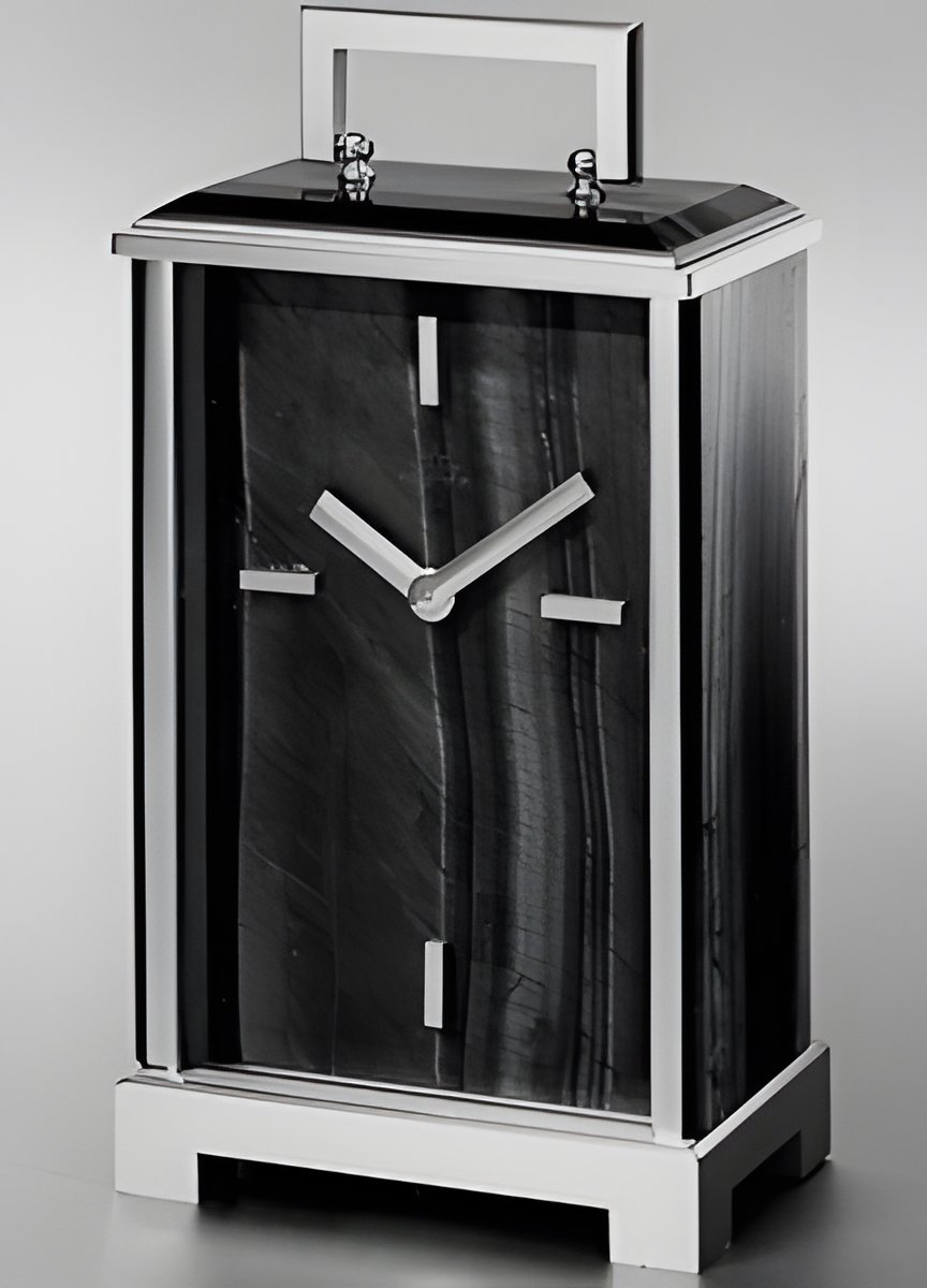 A specialist in the production of small clocks made of precious stone, Pontif a unveils a now collection of such clocks in Basic, including this electric model with brass frame and tiger’ s eye sheathing. Also available in sodalite, rhodonito or malochit. (PONTIFA “Trianon”)