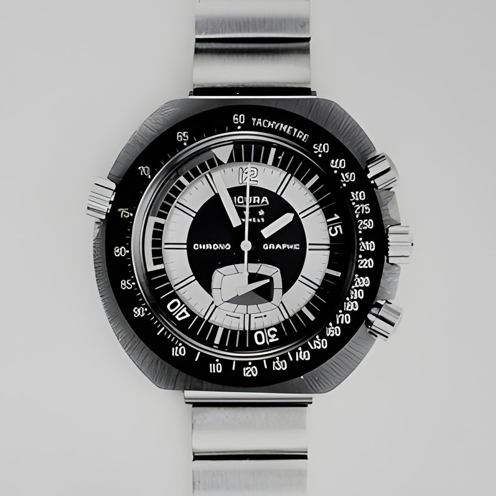 With youthful, modern styling, an economical version of the chronograph. The lateral puspieces control the start, stop and return to zero of the centre seconds hand. An inside turning bezel registers elapsed minutes. Three-colour zone for measuring the 3 x 5 minutes before the start of a regatta. Tachymetric scale on the outer bezel. An instrument that has everything. (SICURA- Chronographe)