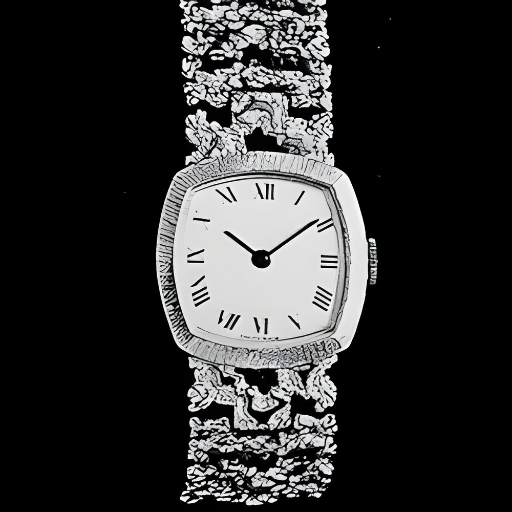 An elegant jewellery-watch shown hero in an “economical” version. The cambered case with guilloché bezel is continued by a bracelet every element of which is cut out and engraved. Roman numerals on the dial. (RENDEX)
