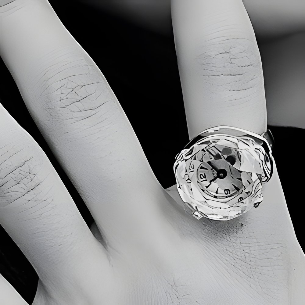 A fun-watch for the younger set the ring-watch. The crystal has a multi-facetted, diamond-like cut and is set on the rhodium-plated case with four claws. (VIATOR-OLIVIA)