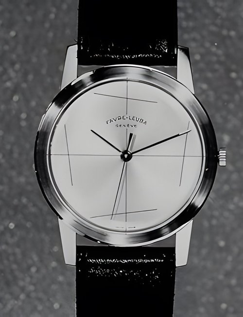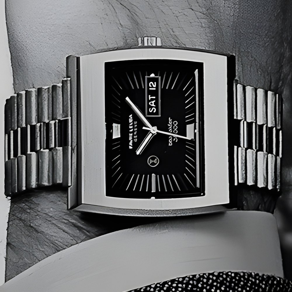 A man’s watch with typically modern and rugged styling Its case, water-resistant to a depth of 50 metres is a blend of straight and rounded lines. It houses an automatic high frequency (36,000 v.p.h.) movement with fast-setting day-date calendar A “stop-second” device enables the wearer to set his watch with utter precision. (FAVRE-LEUBA “Sea Raider”)