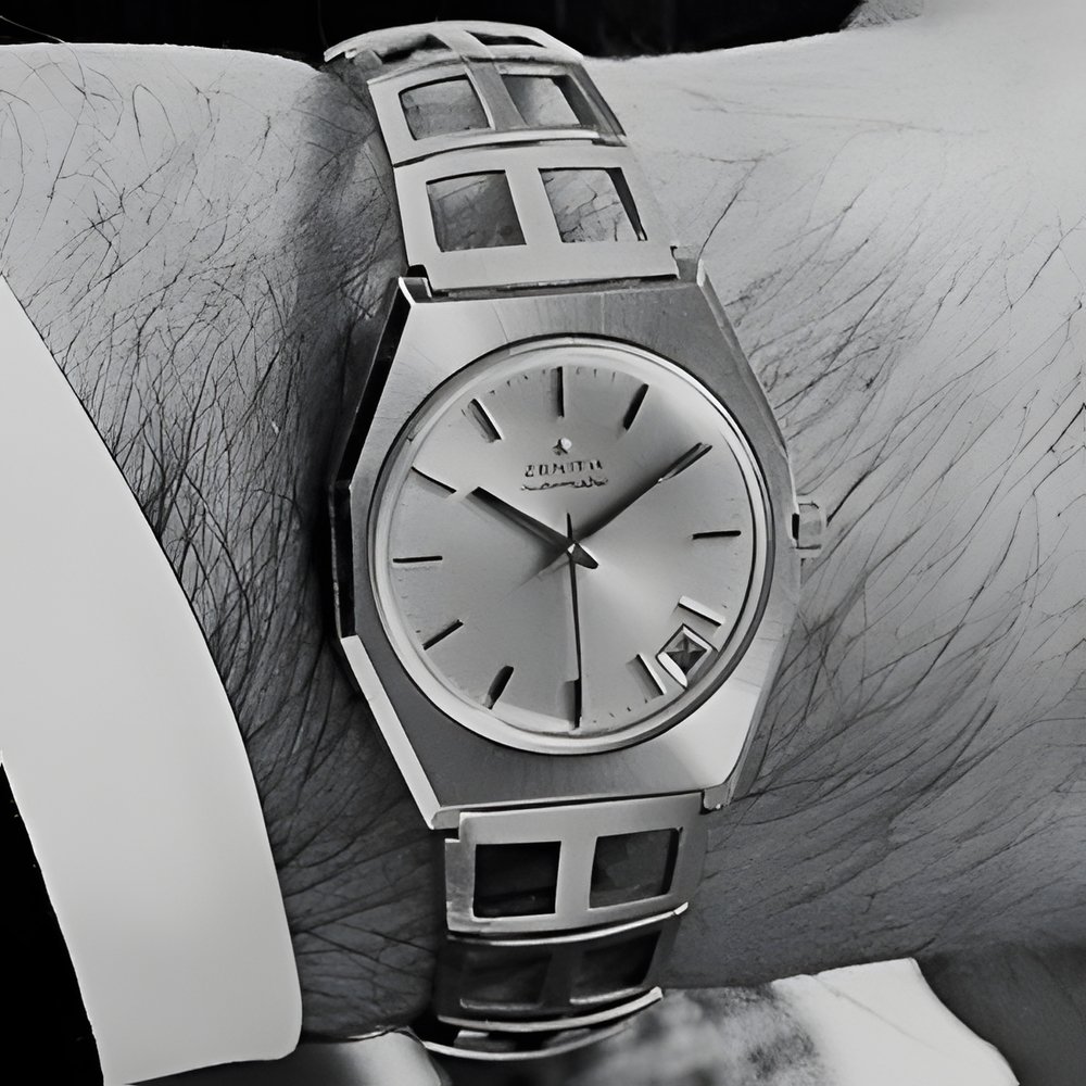 This watch is remarkable for its openworked gold bracelet, each link of which is connected to the next by a tiny hinge. Modern case with straight lines. High-frequency automatic movement, rotor on ball bearings, calendar. (ZENITH)