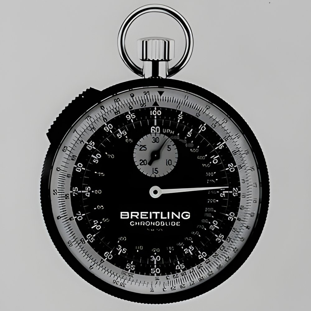 Designed specially for industrial uses, but also suitable for sports timekeeping, this is the first timer equipped with a circular slide-rule. It includes a scale from O to 60 seconds with 1/5th second divisions, a 30-minute counter, a decimal scale, a UPH (units per hour) scale and two logarithmic scales. This model can be used for “snapback” readings and instant re-start, a feature engineers will appreciate when timing industrial operations. (BREITLING “Chronoslide”)