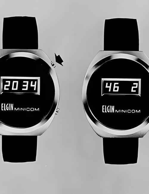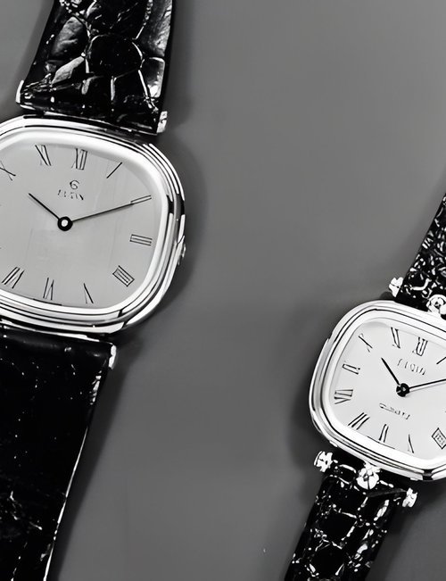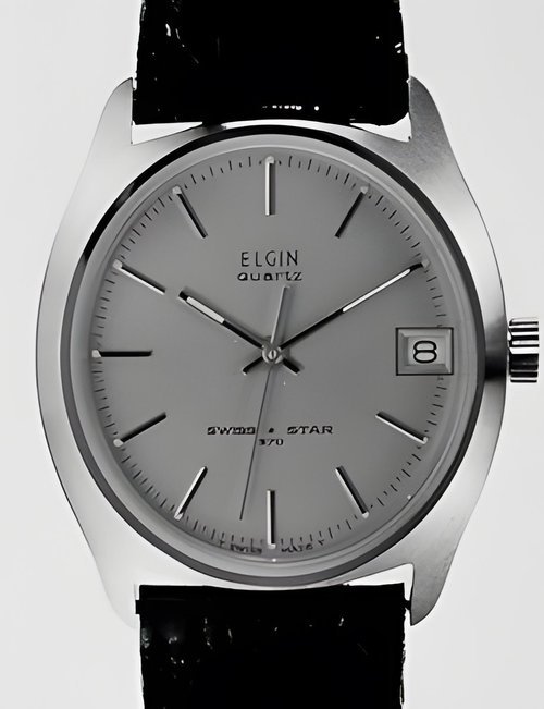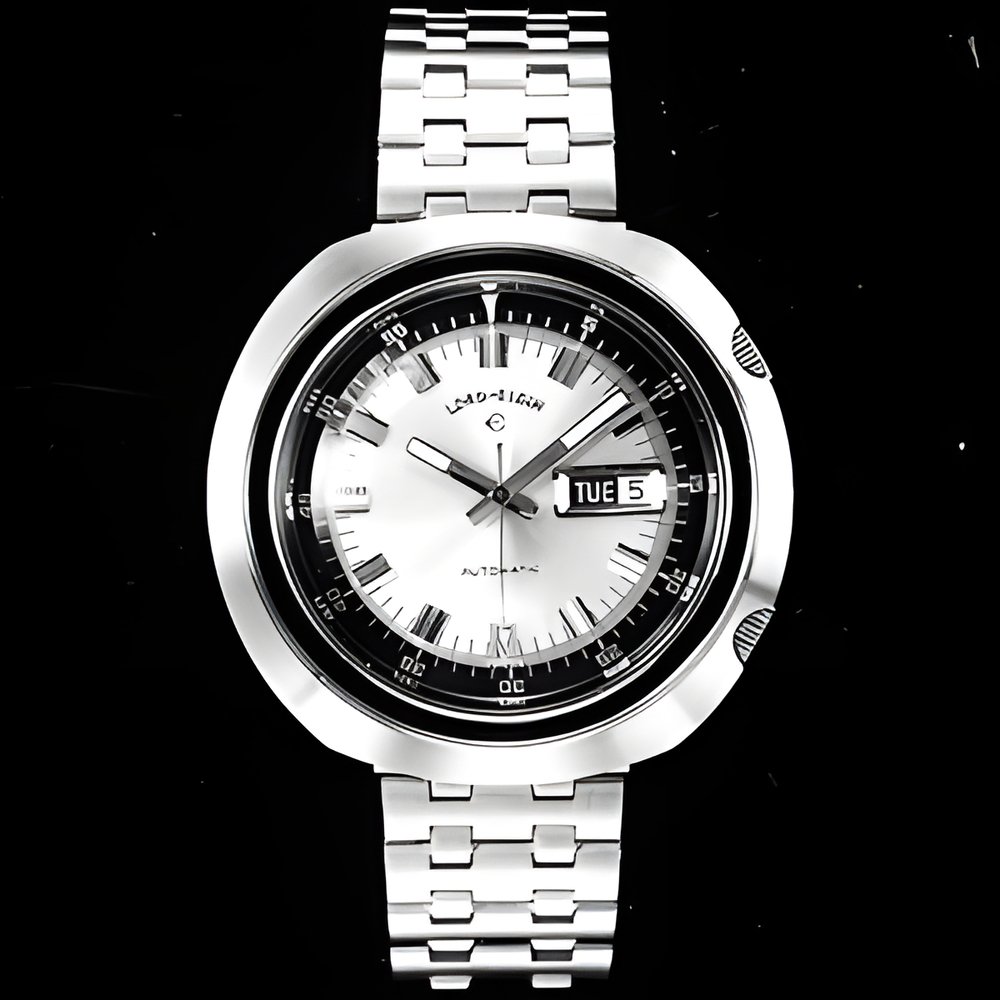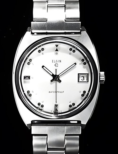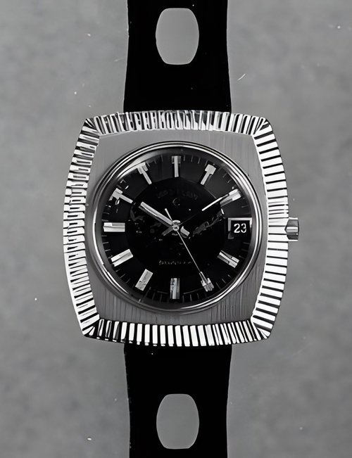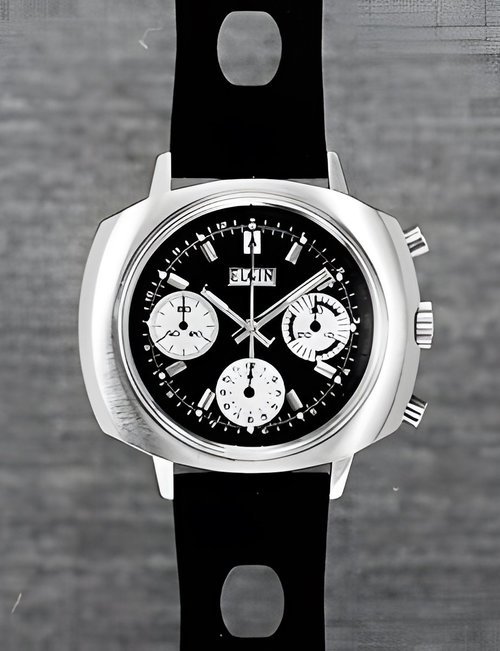 A diver’s watch with definite elegance. Nothing projects from the circular case as the crowns are completely recessed. Water-resistance tested to 10 atmospheres (a depth of 100 metres). Inside turning bezel actioned by one of the crowns. Automatic movement, instant-change day and date calendar. (ELGIN “Lord Elgin”)