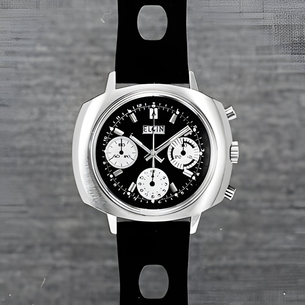 With its wrist-hugging water-resistant case and very legible dial (with tachymeter and telemeter), this chronograph is a very complete instrument. Second, minute and hour timers. Push-pieces are partly recessed to prevent handling errors. (ELGIN)