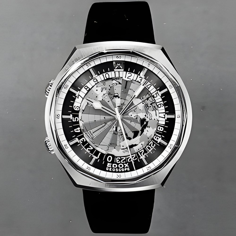 The first wristwatch model on which universal time can be read directly. At the centre of the dial, a coloured planisphère effects one revolution in 24 hours, in harmony with the earth’ s rotation. The time in the main cities of each time zone can be read on the rim. Also gives GMT time and the sun’ s position. All-steel one-piece water-resistant case with scratchproof mineral crystal. High-frequency (28,800 vibrations per hour) automatic movement. (EDOX “Geoscope”)