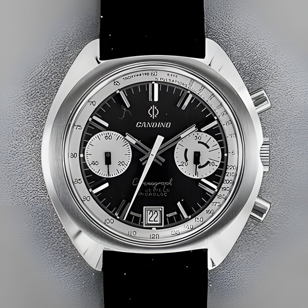 A neat and functional chronograph with large easy-to-read dial despite all the indications it contains. Minute register, tachymetric and pulsornetric scales and calendar. All-steel case, water-resistant to 5 atmospheres (a depth of 50 metres). (CANDINO)