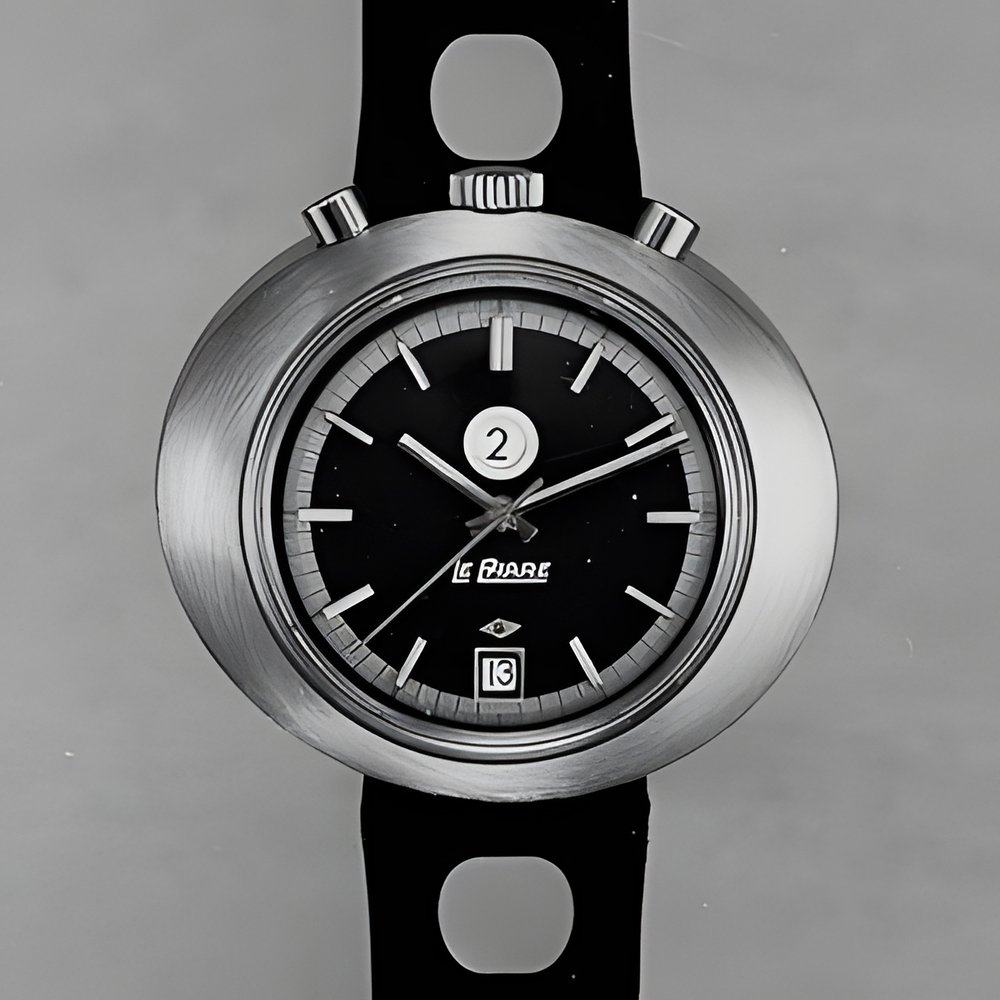 A chronograph designed specially for regatta enthusiasts. When the seconds hand is started, the five fateful minutes before the race appear one by one in a large aperture. In this way, the time remaining before the start is visible at a glance. Case water-resistant to 5 atmospheres. Calendar. (LE PHARE)