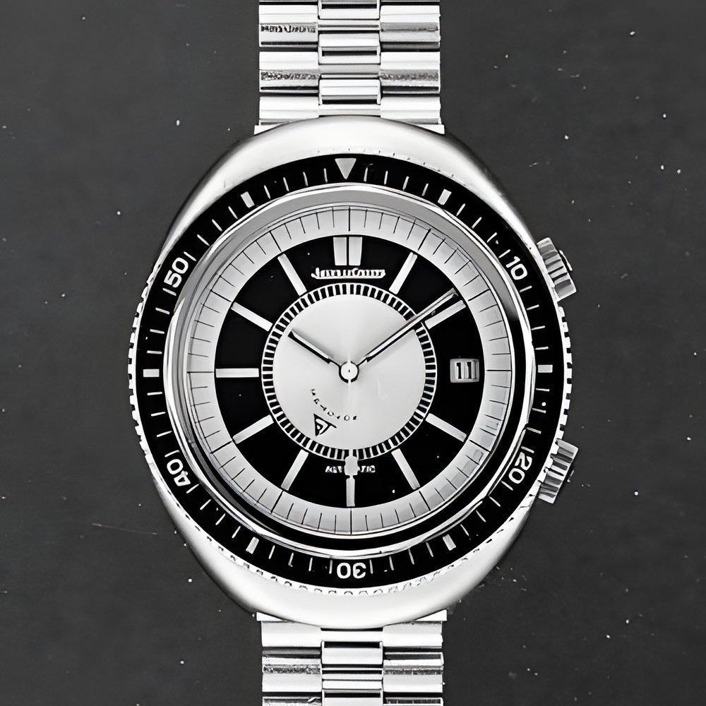 Alarm-watches are making a big showing this year in Basle. Designed for underwater diving, this model has a high-frequency (28,800 v.p0h.) omatic movement hermetically sealed in a stainless steel case which is water-resistant to a depth of 100 metres (10 atm0)0 Turning bezel, tempered crystal and calendar. (JAEGER-LECOULTRE “Memovox-plongeur”)