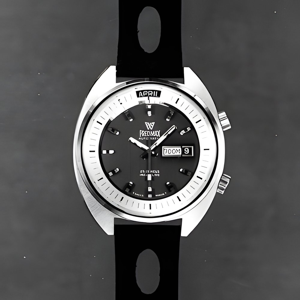 This automatic watch with day and date calendar also gives the month through a separate aperture, controlled by one of the two lateral crowns. Fast date-change system. Note the raised flange on which the minute-circle is inscribed. (PRECIMAX)