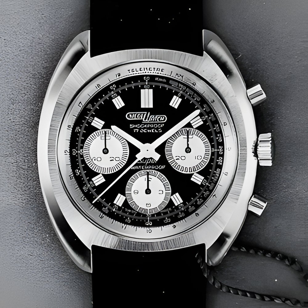 A no-nonsense chronograph is this model which eschews complicated design research. It goes straight to the point short-time measurement. 3 registers seconds, minutes and hours. Telemetric and tachyrnetric scales. Large (Ø 473 mm) rugged case, water-resistant to 10 atmospheres (ioo metres). (NICOLET WATCH)