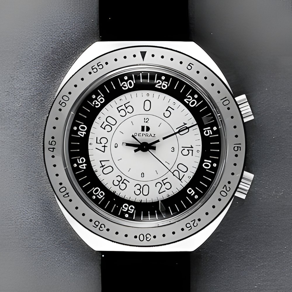 Originally designed by a pilot, this now model can also be of use to sportsmen, engineers and anyone who has to time a given operation. With its two turning bozois, one with the minutes graduated up and the other with reverse graduations, the wearer can see at a glance not only how much time has elapsed since the start of an event but also how much time is left. Well-designed dial divisions with special hands stressing the minutes. Steel case, tested to 20 atmospheres (a depth of 200 metres). (DEPRAZ-FAURE “Computex”)