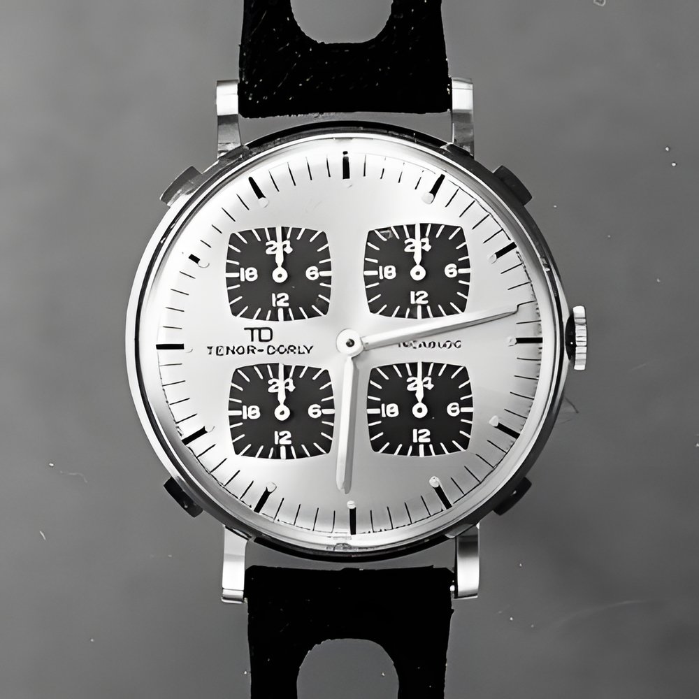 A genuine technical watch Its dial includes 4 registers, each actioned by a pushpiece on the case side. They can therefore all be actioned independently simply by pressing on the pushpiece corresponding to the desired dial. Each small dial can register 24 operations. An ideal watch for a great many sports timekeeping operations or for industrial timing. (TENOR-DORLY “TD-Counter”)
